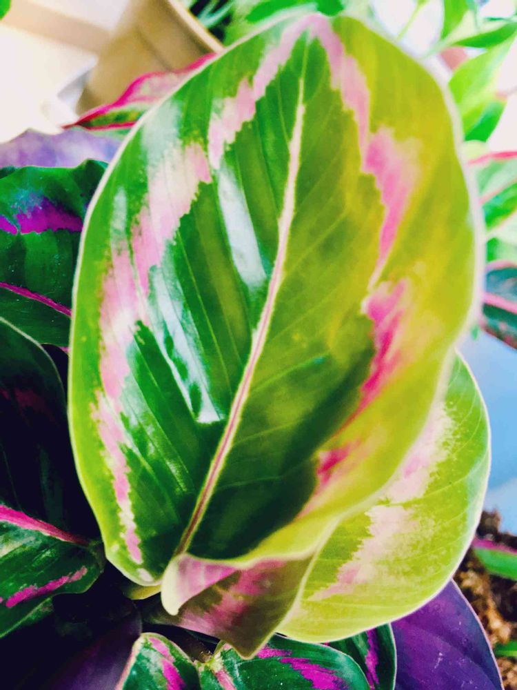 カラテア・プリンセスさんの新芽。まだ薄い色もみずみずしさもピンクのラインもみんな素敵。