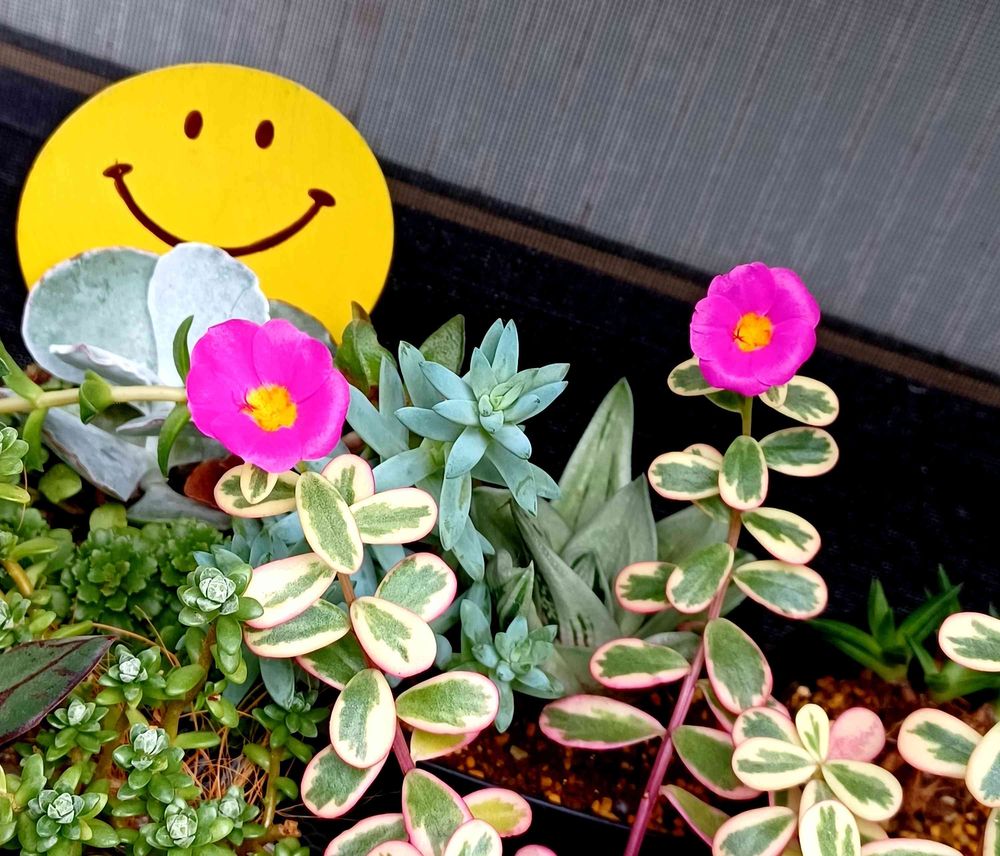 6月に寄せ植えた斑入りのポーチュラカが、今朝•••咲いてました〜٩(>ω<*)و🌺