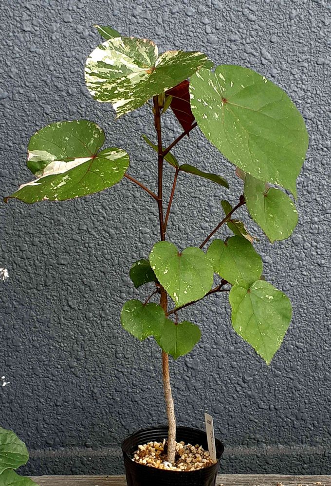 今朝GSでオクラにそっくりなお花を咲かせるオオハマボウの木を見せていただいたあと、園芸店で偶然斑入りのオオハマボウに出合った