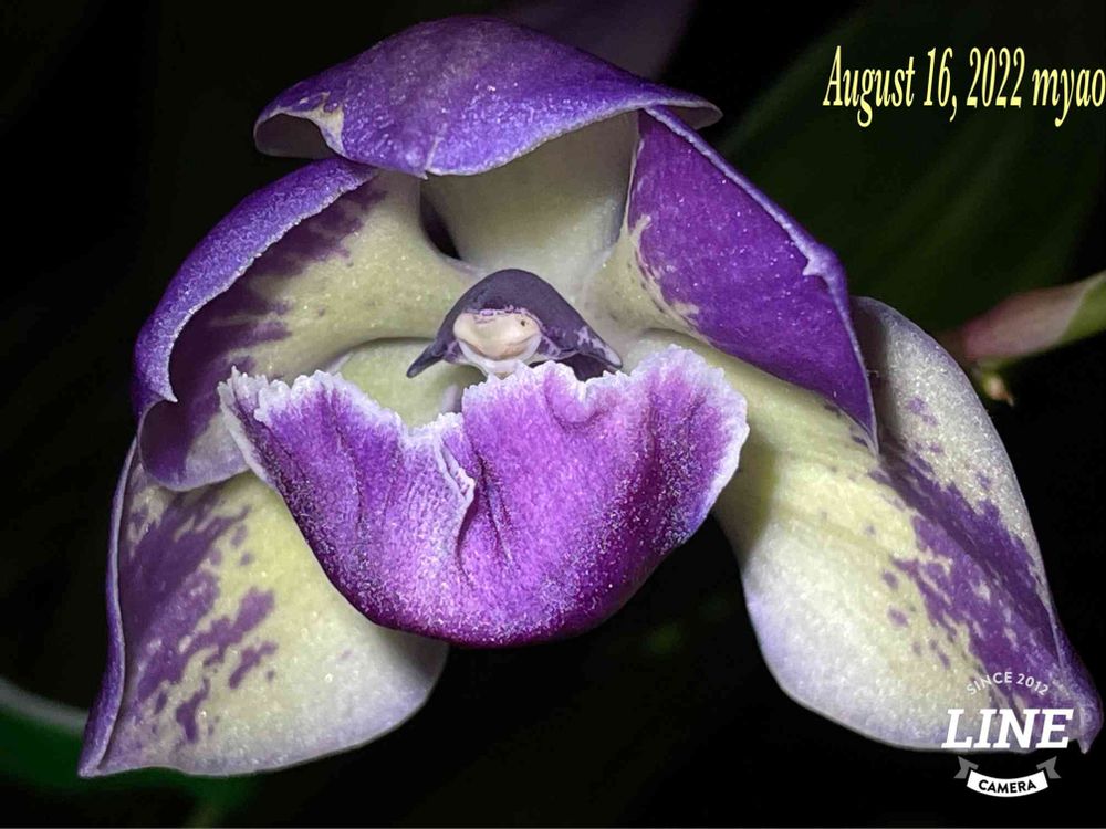 白も紫のコントラストが素敵なお花です僅かですが香りもします。らんの花が咲くと蕊柱に誰か居ないか探してしまう私がいます〜。