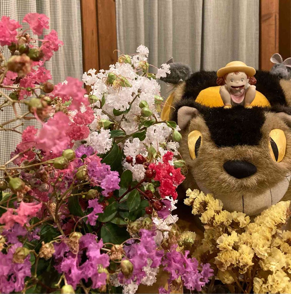黄色いスターチスのドライと4色のサルスベリの森を走り飛ぶ、ネコバスとメイしゃん🤭✨
