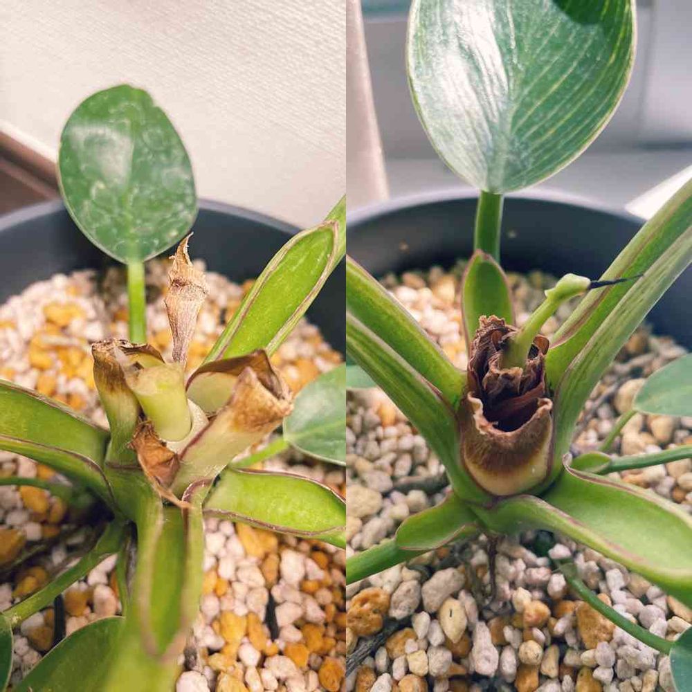 葉の根元から次の葉が出てくるイメージだったので、もう新芽は見込めないかと思っていたら!!なんと!芽が出てきた!(右)