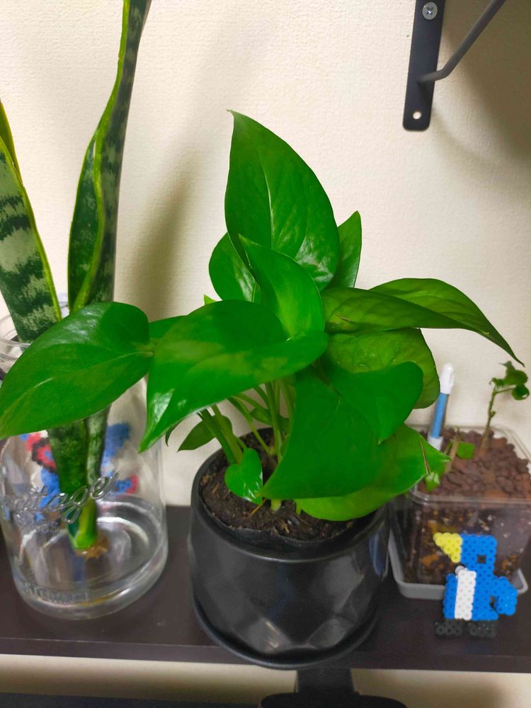 可愛がられてしあわせなポトスちゃんですね。斑入り好きだけどグリーンの単色もなかなかいいなぁ☘️