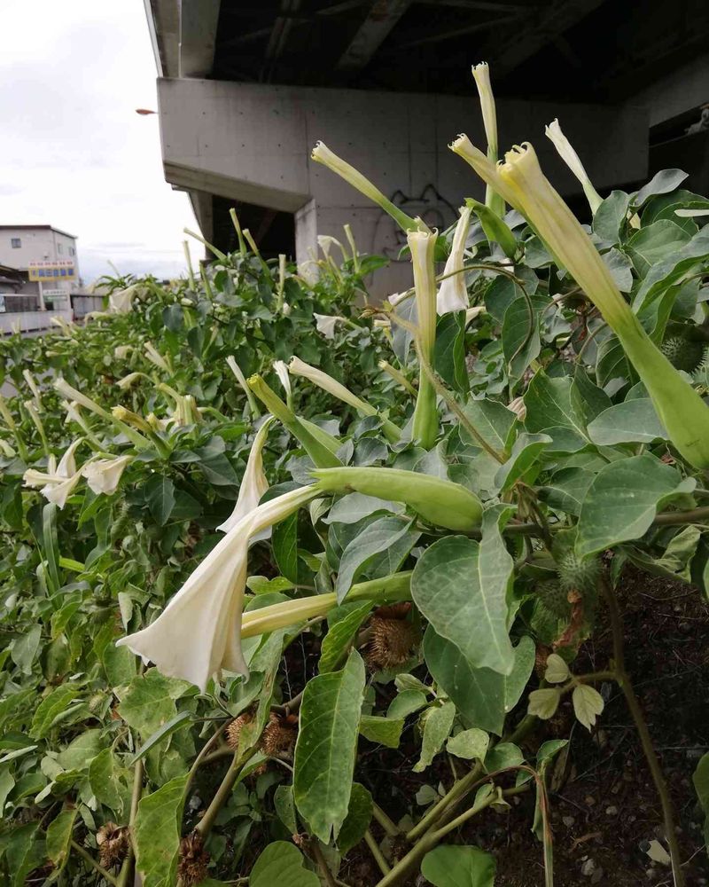 シロバナヨウシュチョウセンアサガオの群生@川越市の入間川上江橋近くの高架下 2022-08-14