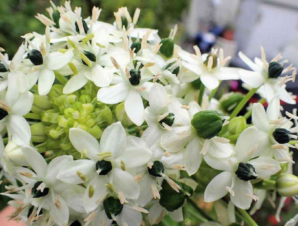 白い水曜日~💖😍🤍💚前出のオーニソガラム・サンデルシー、左右が逆になっていますが、前の写真で左の咲き進んでいたほうが右側の種を付けた花です😊ユニークな形だった右側のお花が、この写真の左のお花で、咲き進むと普通の花型になりました😅💦