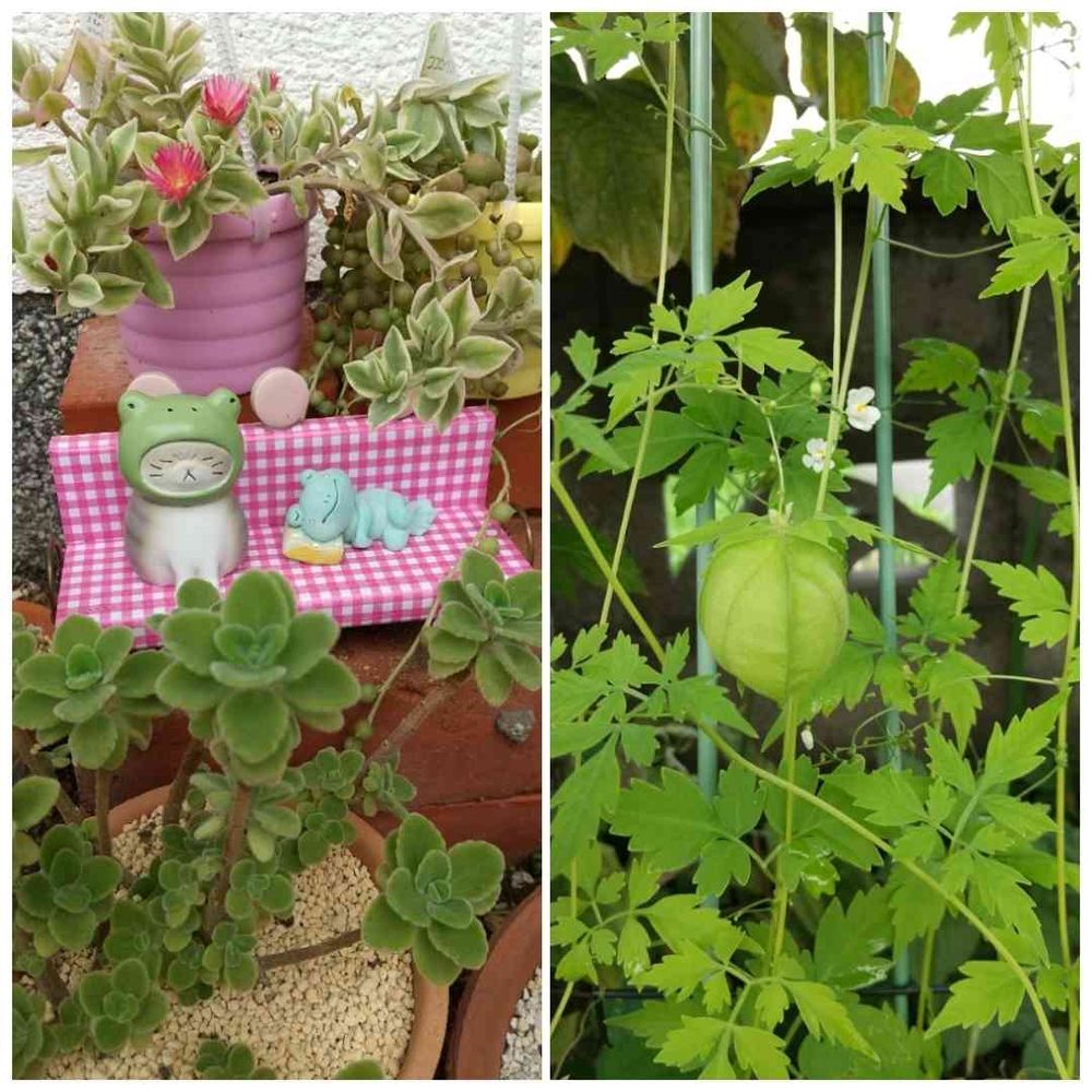 風船カズラに 可愛い実が ユラユラ 揺れたし ベビサンには 赤い花が 咲いてる🌼