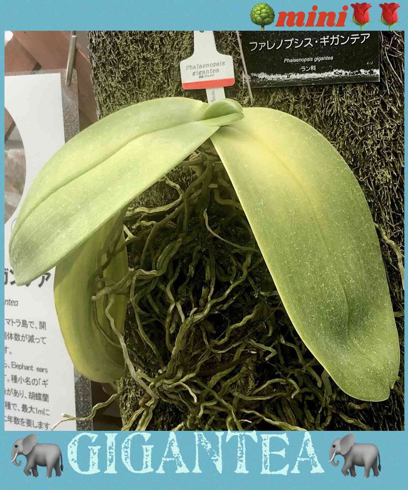 神代植物公園の説明文によるとギガンテアは胡蝶蘭の中で世界最大の葉を持ち、最大1mにも達するといわれています。ギガンテアは「巨大な」という意味が有り、葉が象🐘の耳みたいなので「象の耳ラン(Elephant ears orchid)」ともいわれます。