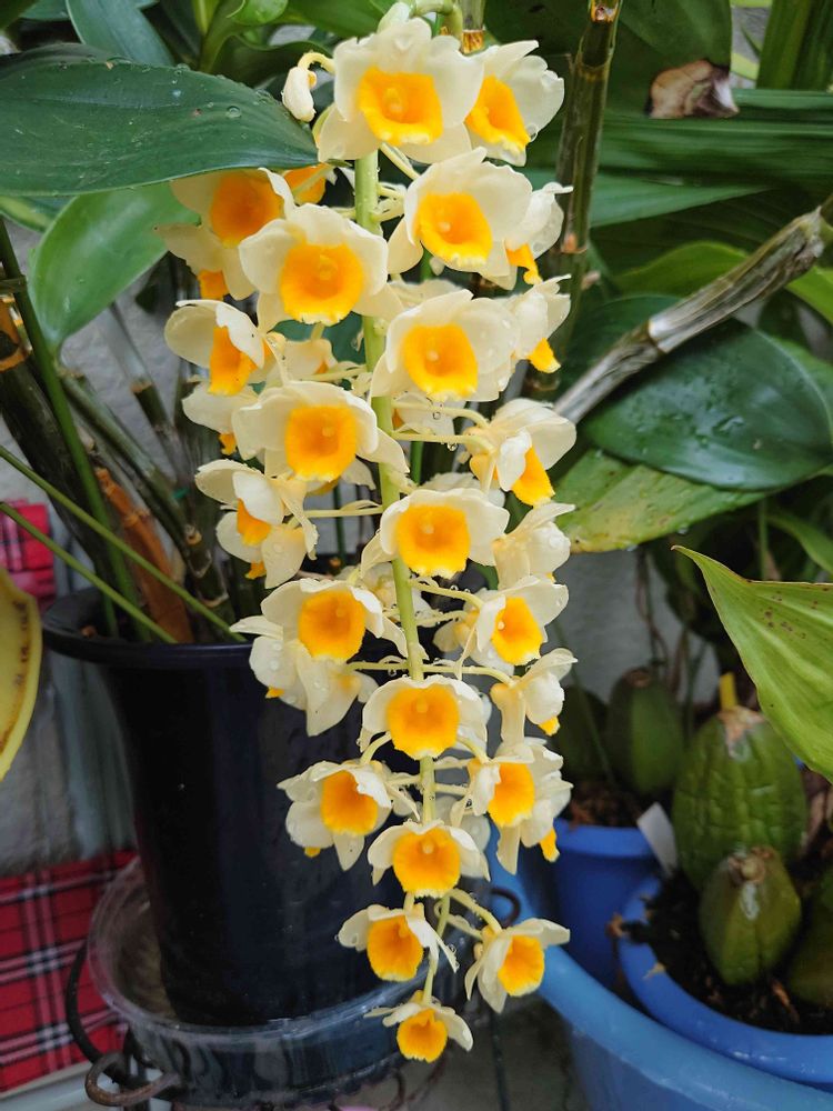 デンドロビュームデンシフローラムが黄色くなってきましたよ。