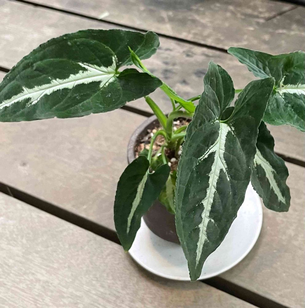 シンゴニウム、検索してみたらとても似ています!他の方の回答の「シンゴニウム・ブラックベルベット」か「ウェンドランディ」の気がします。サトイモ系、可愛いですね!