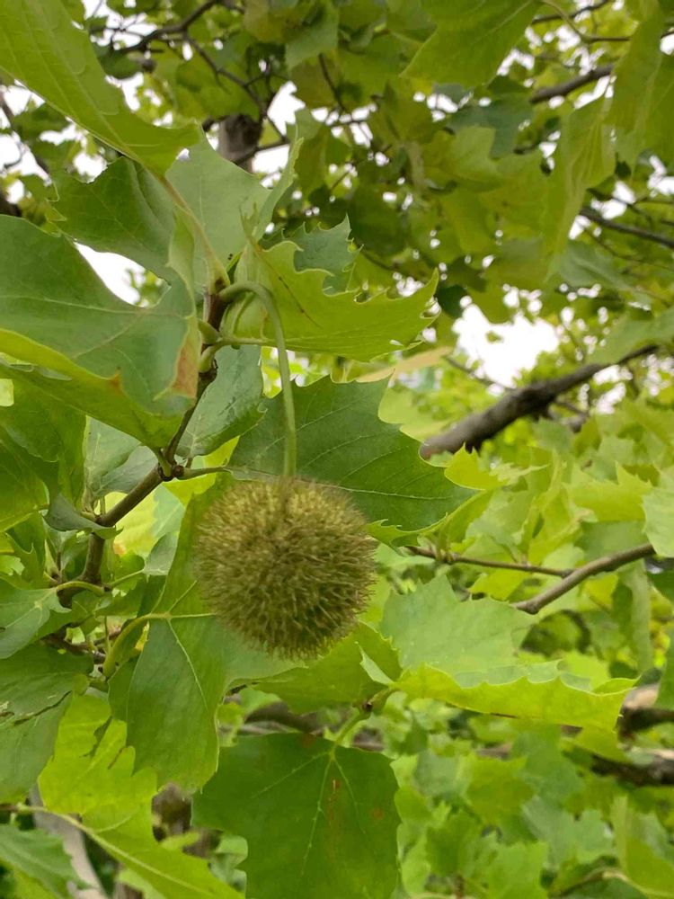 散歩道の街路樹にモミジバフウもあって、紅葉した時のグラデーションが好きです🍁種が落ちた後のカラカラになった実(殻⁇)もかわいいし💕
