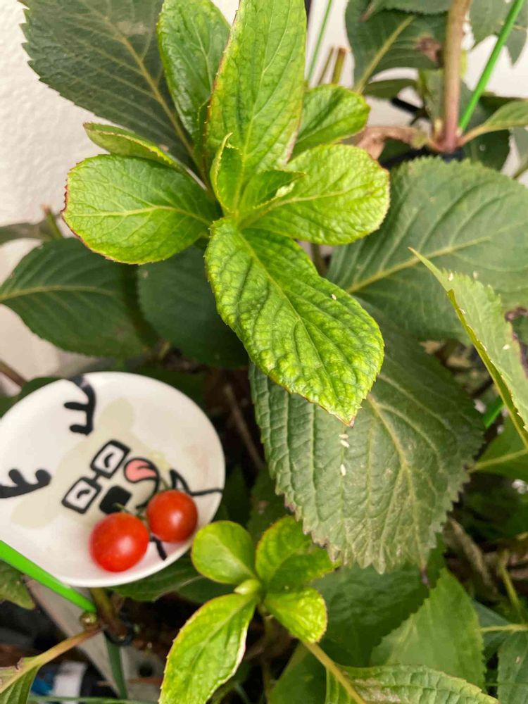 令和4年8月18(木)雨☔️ ガクアジサイ ひな祭り 花が終わって新芽🌱の上で✂️カット後です。今朝収穫の種蒔きミニトマト🍅🍅もいっしょに📸