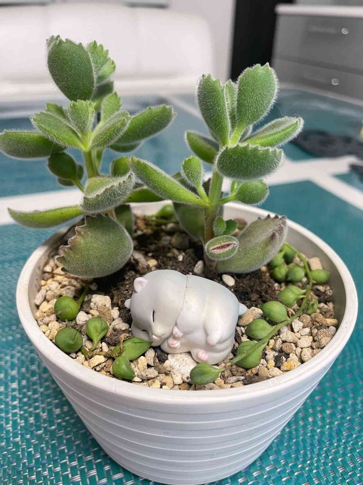 熊童子の鉢にガチャのハムスターちゃん、そして切れてしまったグリーンネックレスを入れておいたら根付いたみたい👍