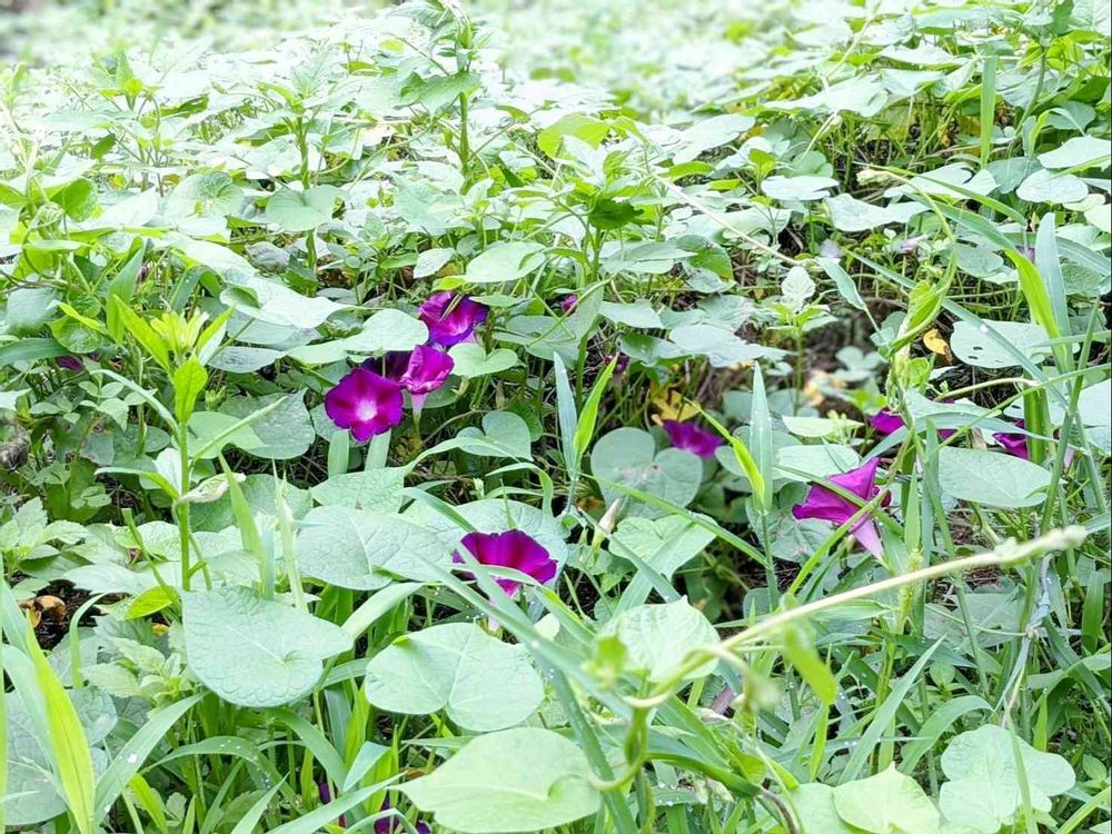昨日庭の斜面を歩いていると お隣りとの境界迄大きく茂っている雪柳に隠れた向こう側の土手に 赤紫の朝顔が草に埋もれて沢山咲いているのを発見!