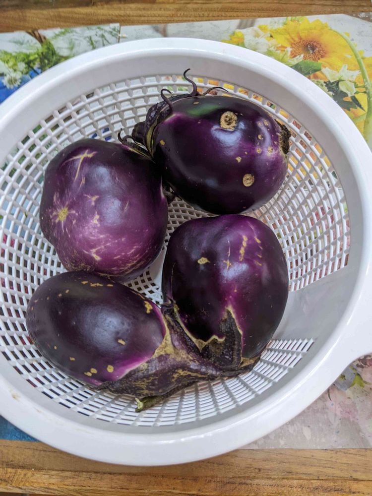 畑より。ナスビ収穫しました。まだ小さいサイズでしたが、虫に食べられる前に、チョッキンしました。🙋🥳☀️😅🌱🌿✂️