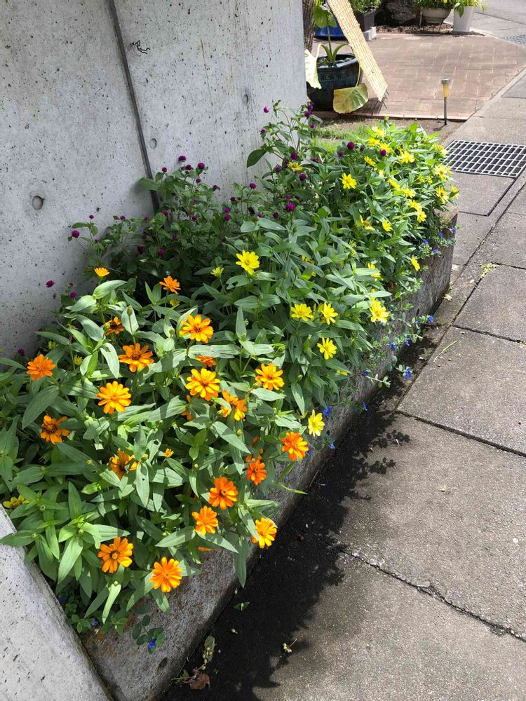今日のお花💐ヒャクニチソウ🌼ジニアも、百日草の仲間だったんですね。春に種を蒔いたものを、地植えにしました。もう少しで、満開です。玄関前を、賑やかにしてくれます。アメリカンブルーが、下の方に押しやられました💦