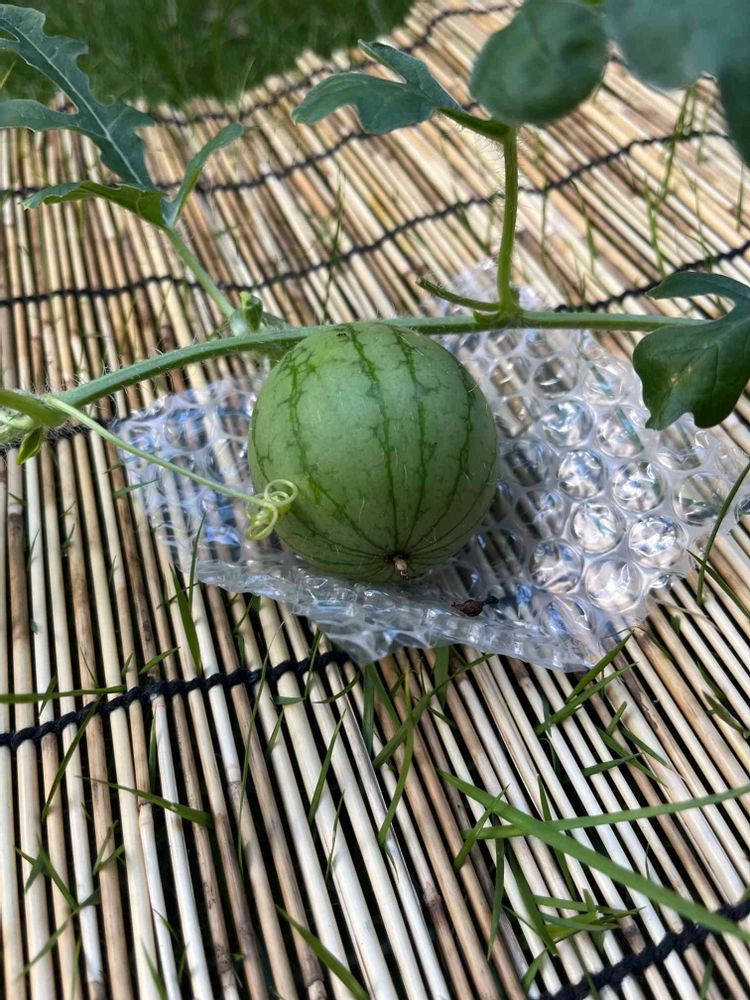 2個目のスイカは這うバージョンなので下にプチプチを敷いてみました。随分成長しました🍉