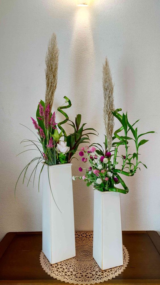 こちらは…先日パンパグラスも購入したので…今日も農園にいってお花ちょっとだけ買ってなんとかパンパグラスいけてみました。お花がいいなと思うものがなくてどのようにまとめようかと考えた結果、投げ入れにしてみました👍💕