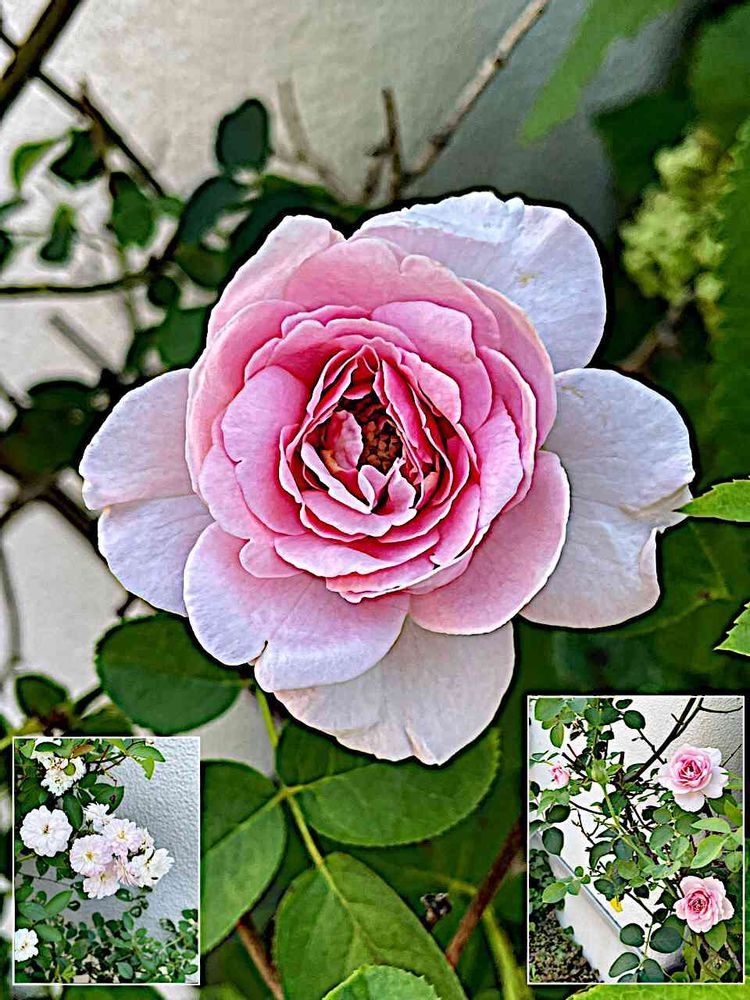 カタバミさんのお出かけ先,バラ(薔薇),/白壁に寄り添う観るは、白やピンク・薄紫のツル性花/の投稿画像