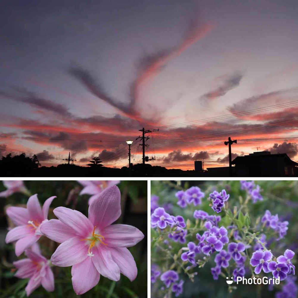レインリリー💗💗とデュランダ💜💜のお花が、朝焼けの空にインパクトありですね❣️