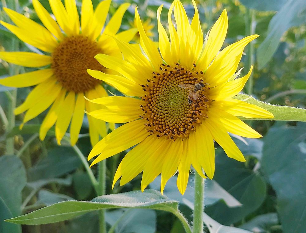 ひまわりの花で蜜蜂が忙しく働いていました。