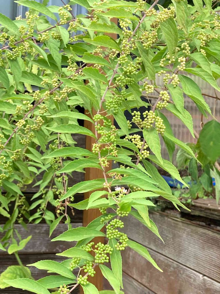 まだ緑の未熟実ですが これから紫色に色づいてきます。待つのが楽しみな花です。