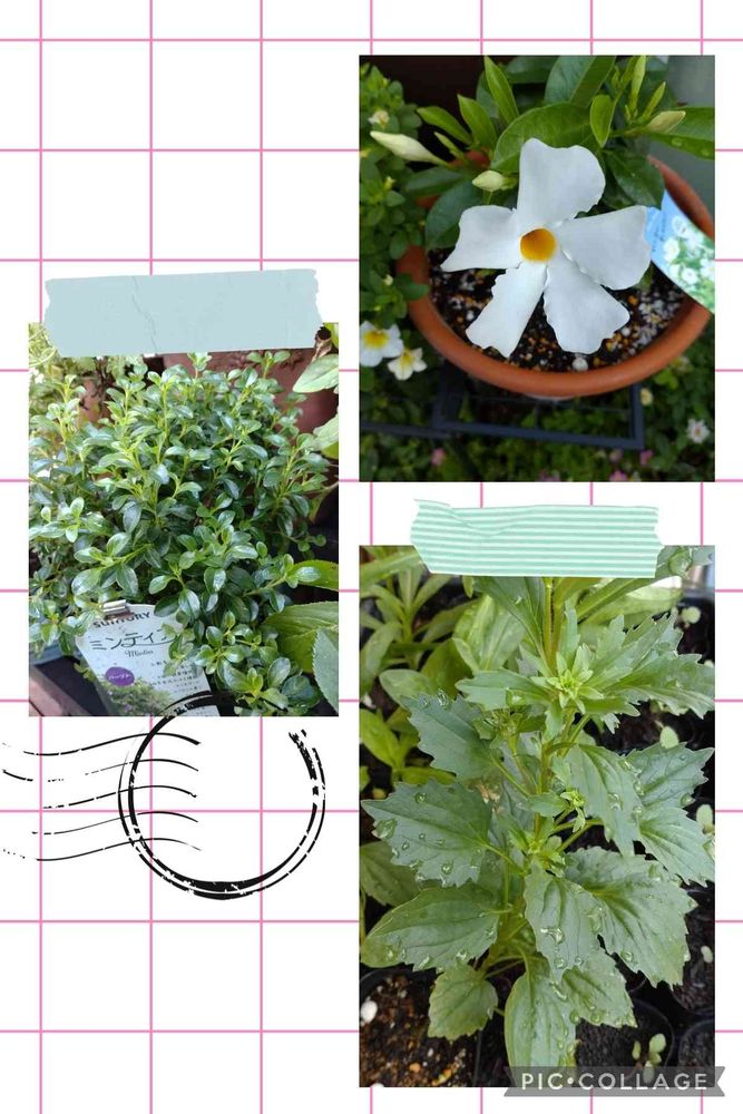 ミンティア、一向に小花を咲かせないです😅でもグリーンがとっても爽やか🍃❀.(*´▽`*)❀.サンパラソル、たくさんの蕾を付けてくれています🎶はじめはどうなるか正直不安でしたが今は安心✨