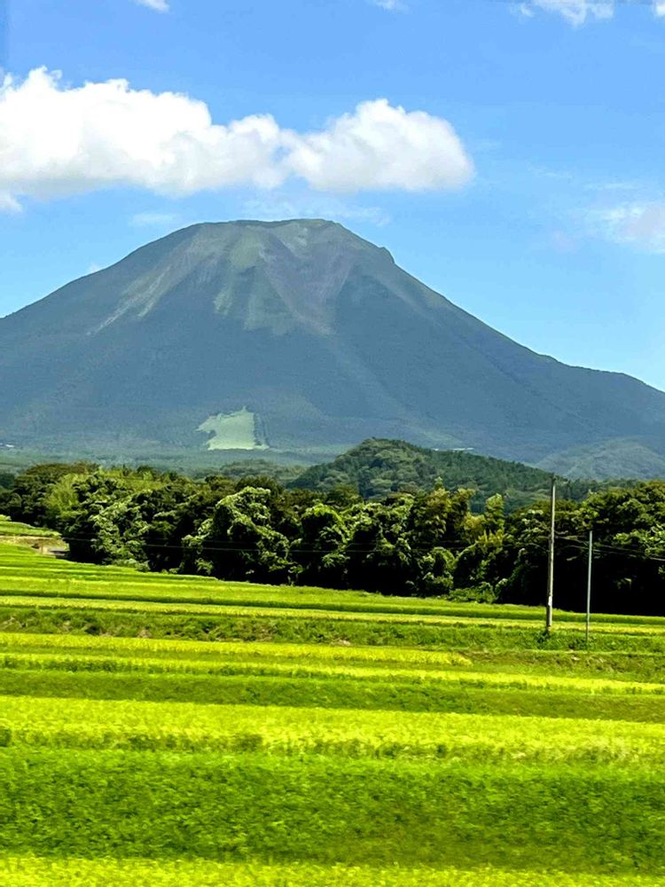 稲穂のキラキラした緑と青みがかった大山が美しいですね🌾⛰