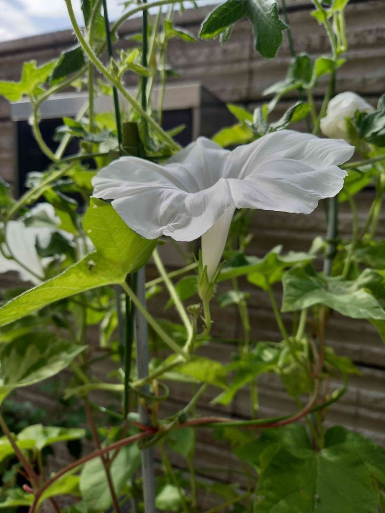朝顔の白もピンクも昨年の種採ったの。一緒に植えたらピンクに負けるみたいです。