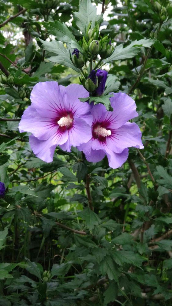 ムクゲは 日の出とともに開き夕方には萎んでしまう1日花ですが 花期が長く次々と新しい花が咲いてくれます。