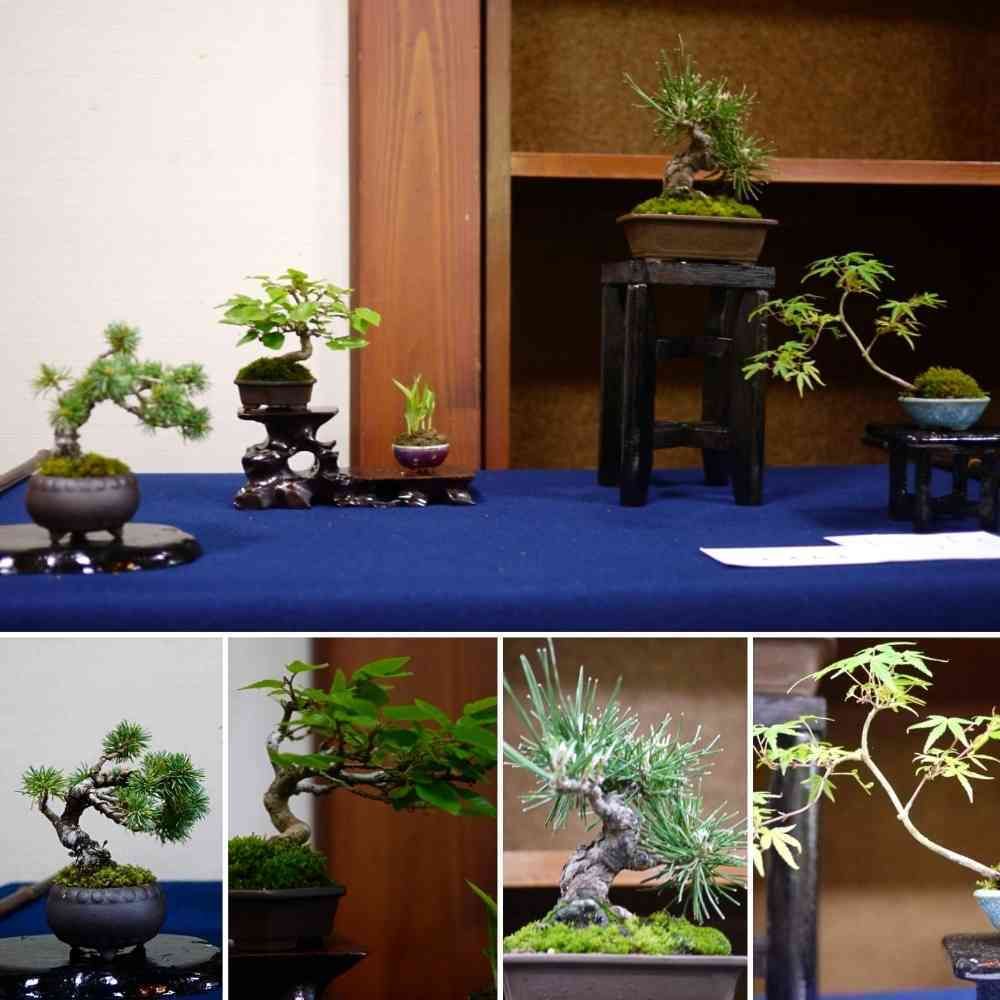 左から五葉松、イワシデ、サギ草、黒松、長良川モミジ。