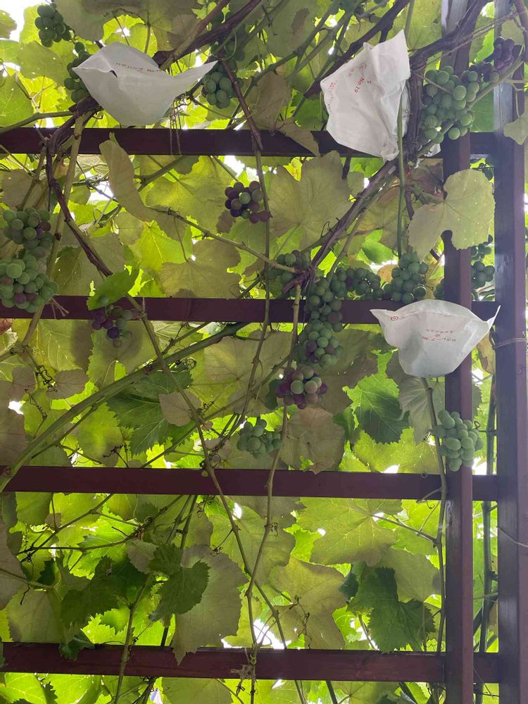 オーガニック育てなので、葉がぽこぽこなってますが、なんとか沢山なってくれています😁🍇