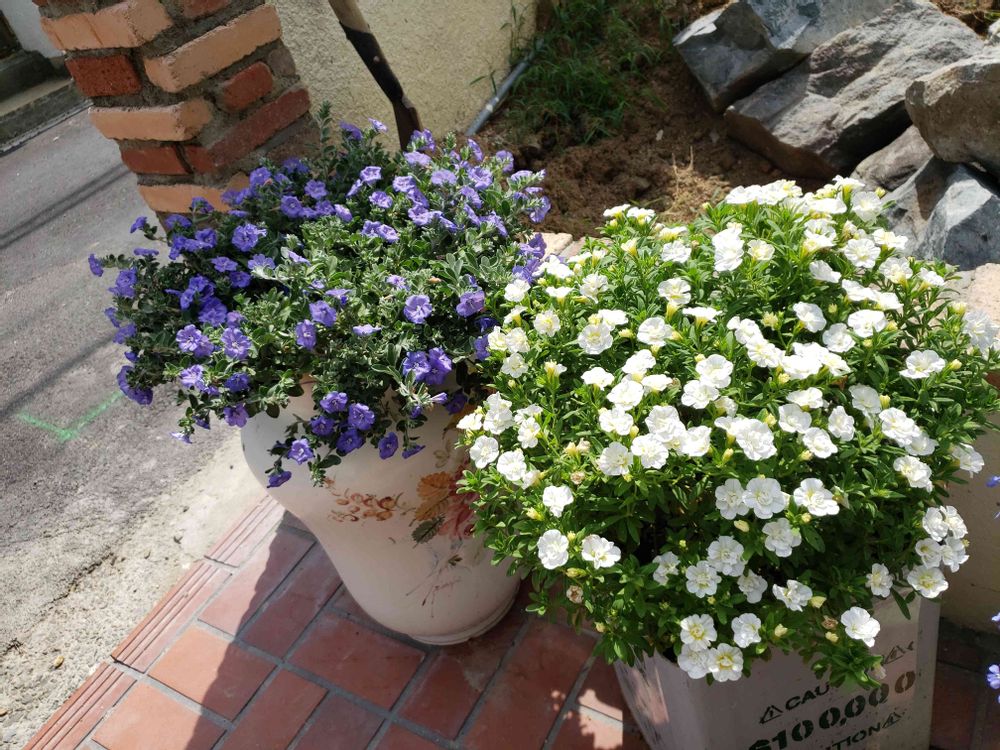 21年5月のモニターのエボルブルスとスーパーベルのミルクレープさん、1斗缶や、壺の鉢のお陰で水切れしてないからかな?元気です(*≧∀≦)人(≧∀≦*)♪