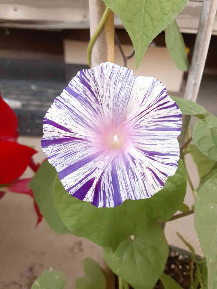 朝顔咲きました。品種名は分かりませんが絞り柄が綺麗な朝顔です。