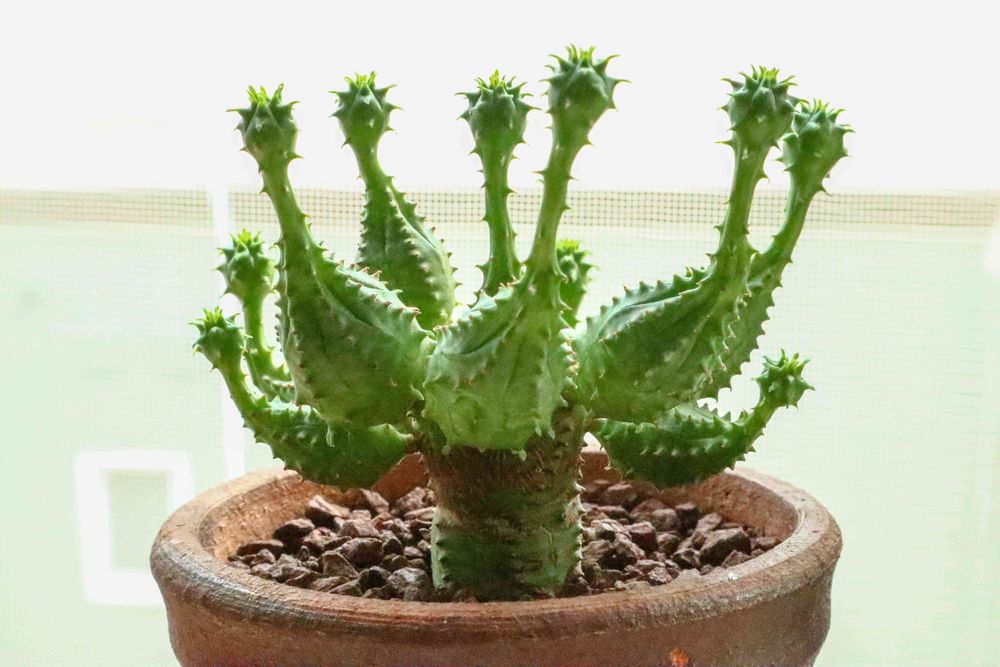 薄暗い店内で徒長しまくってた子を日当たりのよい場所に置いといたら先っちょだけ太くなり始めたところ(笑)