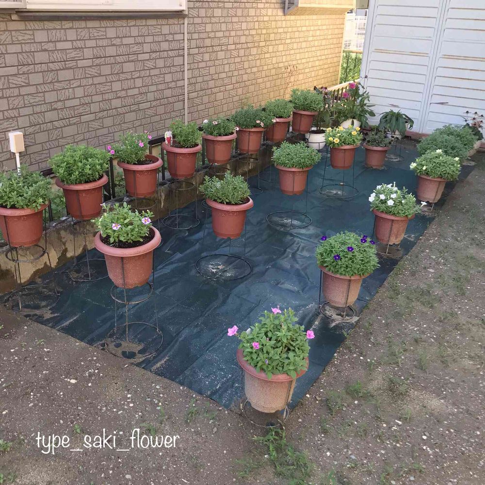 お引越しのもにょもにょでお花達は気になりつつも放置で(ごめんだよ)💦すぐに草取りも庭造りも出来ないので防草シートを押さえる様に、鉢を並べたよ草取り対策のつもりです🐒雨で汚れた鉢も気になります🙈