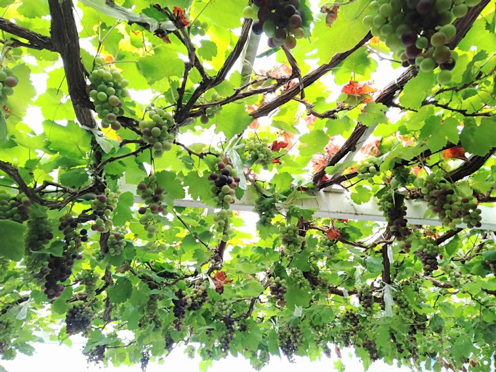 実家のぶどう棚、うちのぶどうもこのくらいたくさんなるといいんだけど。