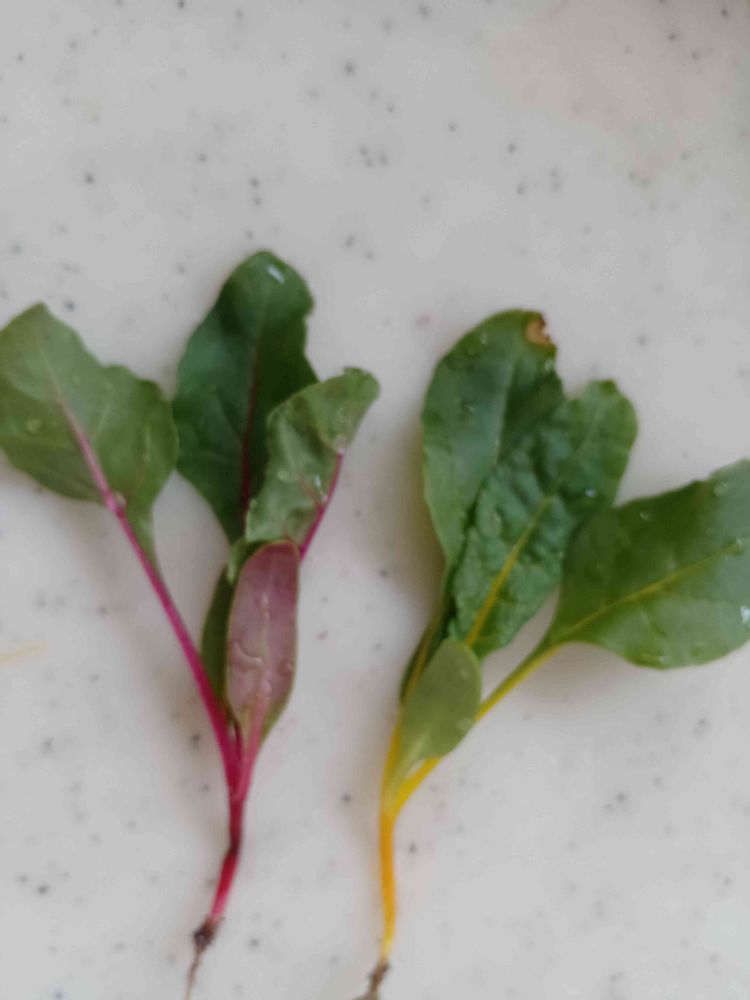 多分まだ早い気はしたんですが、スプラウト感覚で食べてみようと思います。茎の色が色々あるうち、しっかり育ってる感じの赤と黄を抜きました。やっぱりうちでも赤レンジャーは成長リーダーでした。