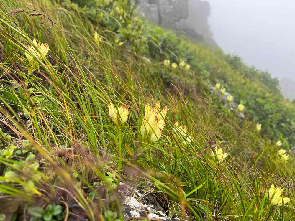 雨の中、火打山からのテント装備の縦走はなかなか大変。山頂ついてのご褒美は、ガスの中、群生するトウヤクリンドウ。