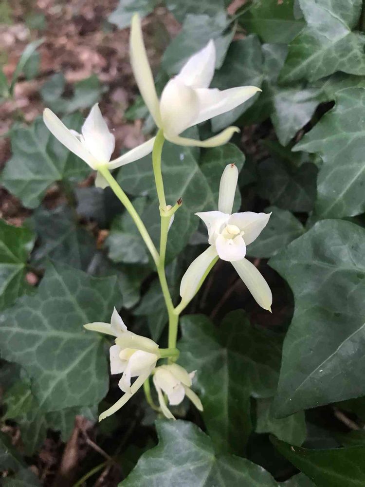 昨日、マヤランを探していつもの公園内をウロウロしていたらこの個体に出会いましたー😊。最初はマヤランのシロバナタイプかと思いましたが、家に帰ってから調べると、遺伝子分析でマヤランとは別種と判明しています。見た目👁はマヤランの白花です♪😊。暗い林内に咲いていました。ピントは暗いので右側の花にしか合っていません😭。もちろん初認です♪😊。