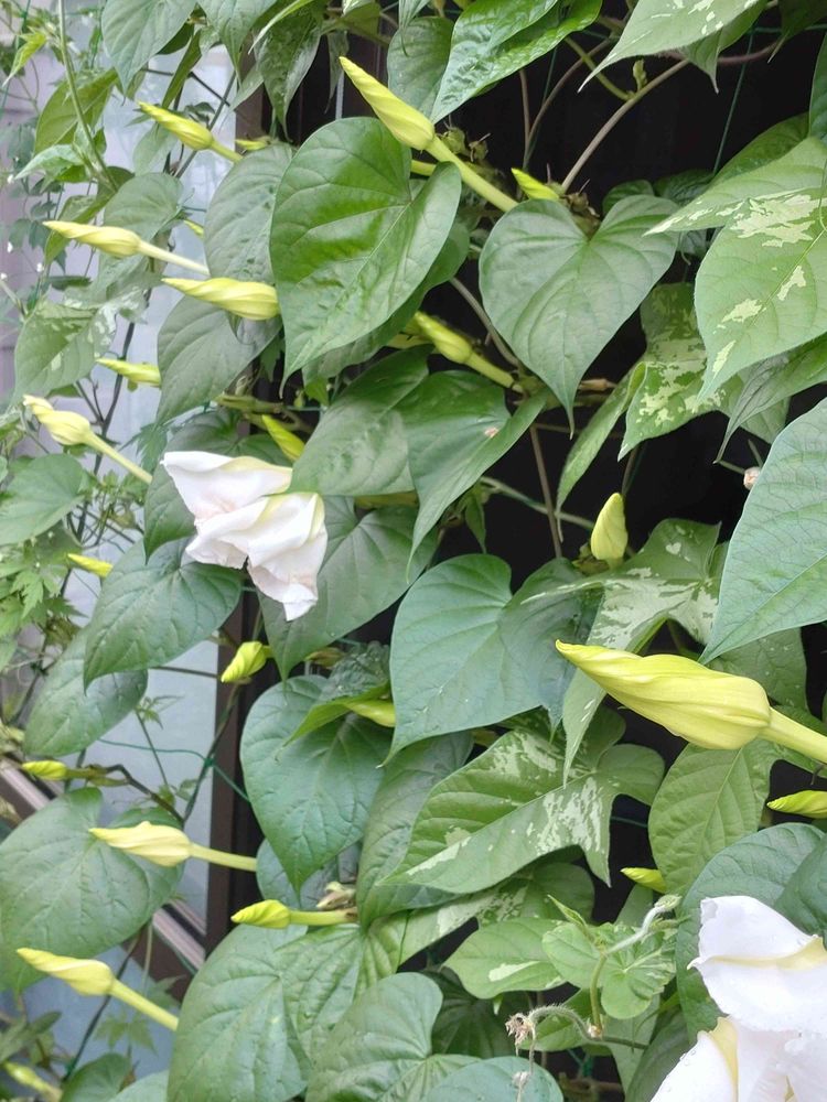 今年始めて植えたのですが朝顔と一緒に日除けのつもりで網に這わせて……ところが蕾が日中のお日様うけて垂れてしまい咲かずじまいもあり残念なこもいます