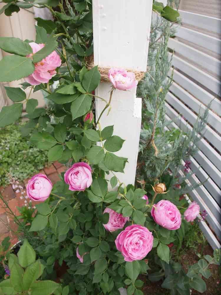 ポール仕立てですが、昨年秋にバラの家からお迎えしたばかりの新米なので、下の方ばかり咲いています。