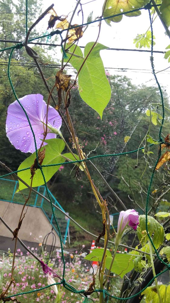 枯れてしまったゴーヤのネットに絡みついて咲いている朝顔💜