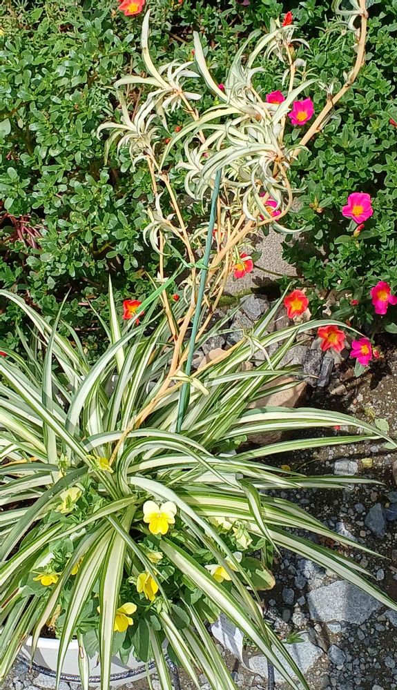 こんにちは。オリヅルランとビオラさんのコンビいいですね。私は今、オリヅルランとベゴニアのコンビで作り始めました。