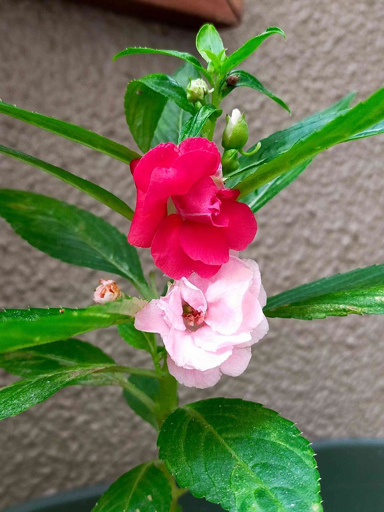 今朝、🐕の散歩に行こうと玄関ドアを開けたら、「あら?ピンクの鳳仙花に赤い子も😄」