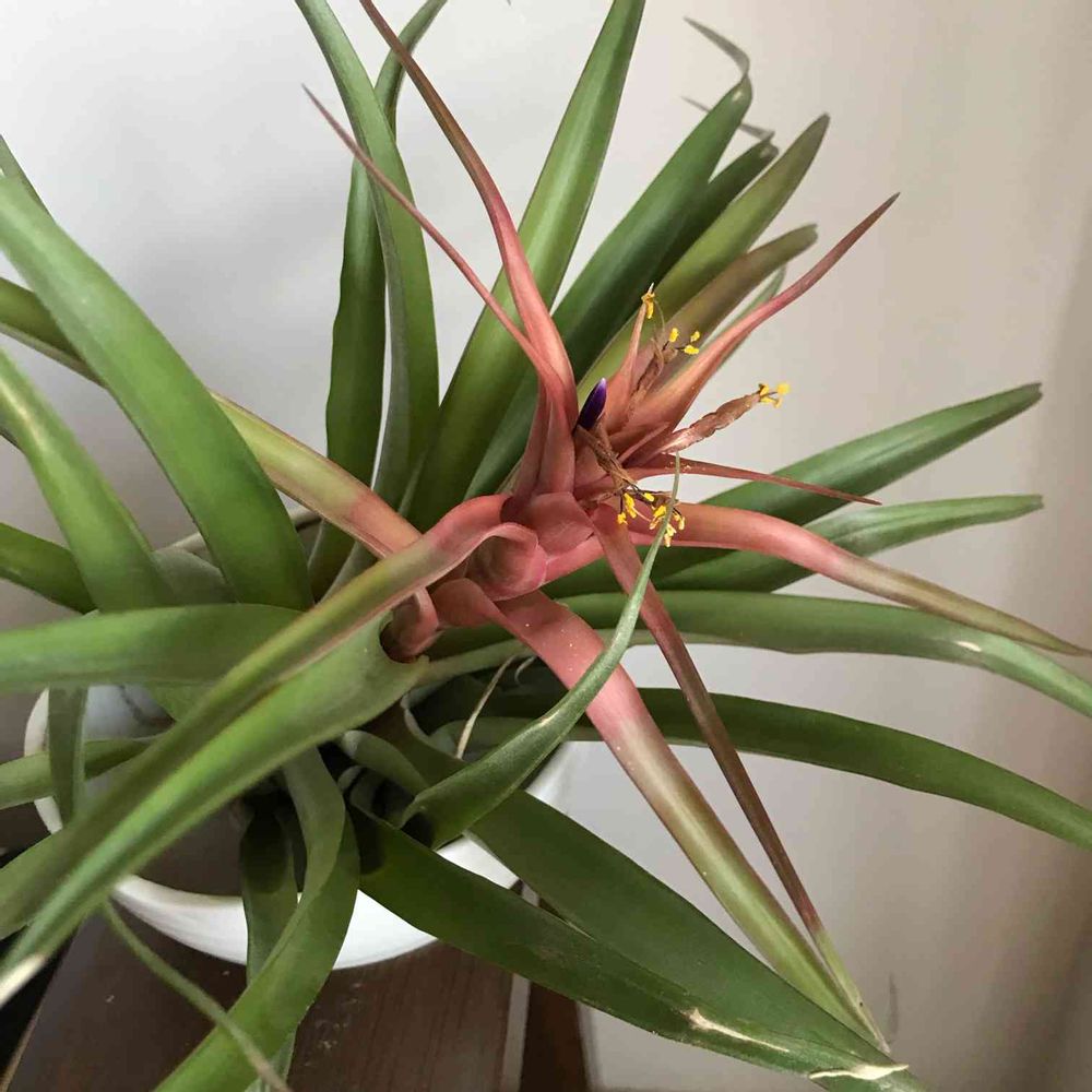 頂いたエアプランツ カピタータ、中心部が赤味を帯びてきて、お花が咲きました。
