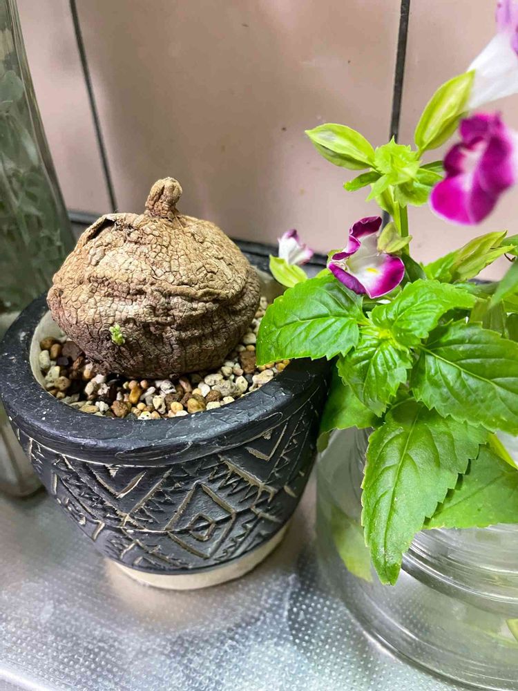 こんにちは。「ステファニアピエレイ」ちゃんの表面に出ている緑のが、花芽なのでしょうか?トレニアが不思議そうに覗き込んでいますね。どちらも可愛らしいです。