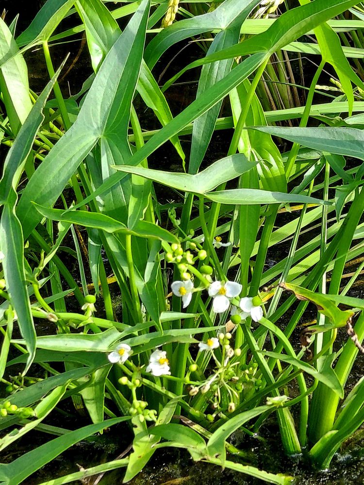 田んぼに先が尖った矢じり形の葉が特徴的な「オモダカ」の花が咲いていました♡