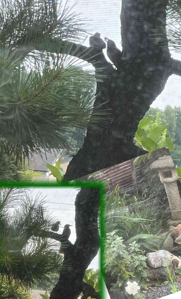 松の木の枝に、山鳩さんの親子🐦🕊らしき2匹が…。1時間近くも😊 親鳥さんが、