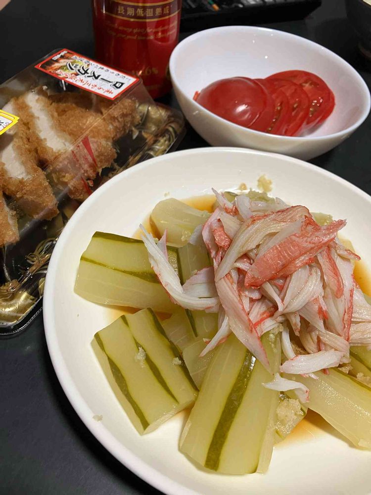 今晩のところは冷たいままお皿に盛り付けてカニカマを乗せて生姜をきかせたポン酢でどうぞ♫🥒