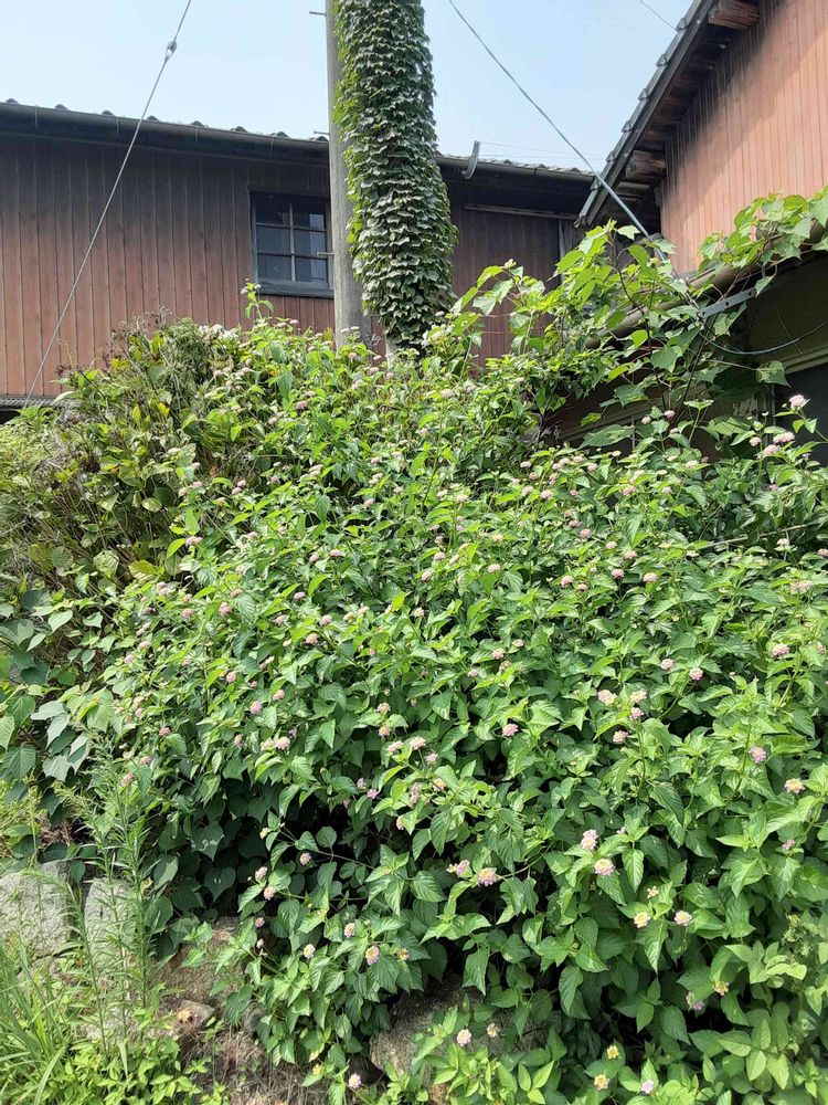 月曜日の外回り先の風景です。ランタナ、紫陽花が雑草のように生い茂っていました。蔦が絡まった電柱が中央にあります。豪快。